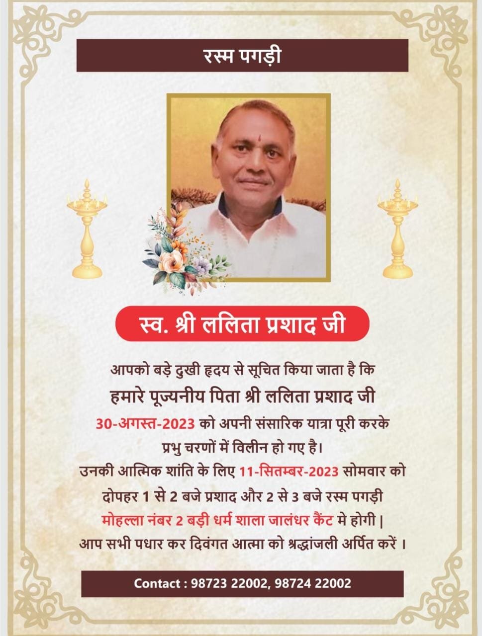 स्व. श्री ललिता प्रशाद की रस्म पगड़ी बड़ी धर्मशाला जालंधर कैंट में 11 सितम्बर को