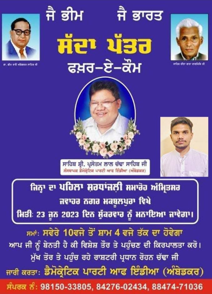 ਡੇਮੋਕ੍ਰੇਟਿਕ੍ ਪਾਰਟੀ ਆਫ਼ ਇੰਡੀਆ ਦੇ ਸੰਸਥਾਪਕ ਸਾਹਿਬ ਸ਼੍ਰੀ ਪ੍ਰਸ਼ੋਤਮ ਚੱਡਾ ਦਾ ਪਹਿਲਾ ਸ਼ਰਧਾਂਜਲੀ ਸਮਾਰੋਹ ਅਮ੍ਰਿਤਸਰ ਵਿਖੇ 23 ਨੂੰ ਜਾਵੇਗਾ ਮਨਾਇਆ-ਰੋਹਨ ਚੱਡਾ
