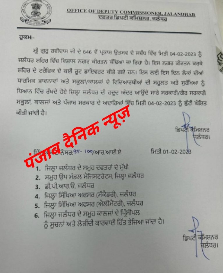 जालंधर (पंजाब दैनिक न्यूज़) 4 फरवरी को जालंधर जिले के सभी सरकारी स्कूल, कॉलेजों छुट्टी रहेगी। जालंधर के प्रशासन ने यह फैसला लिया है। इस दिन सरकारी दफ्तर भी बंद रहेंगे और कोई काम काज नहीं होगा। जालंधर में 4 फरवरी को श्री गुरु रविदास जयंती के उपलक्ष्य पर शहर में शोभा यात्रा निकाली जाएगी। जिस वजह से जिले के सभी सरकारी स्कूल, कॉलेज और दफ्तर बंद रहेंगे।
