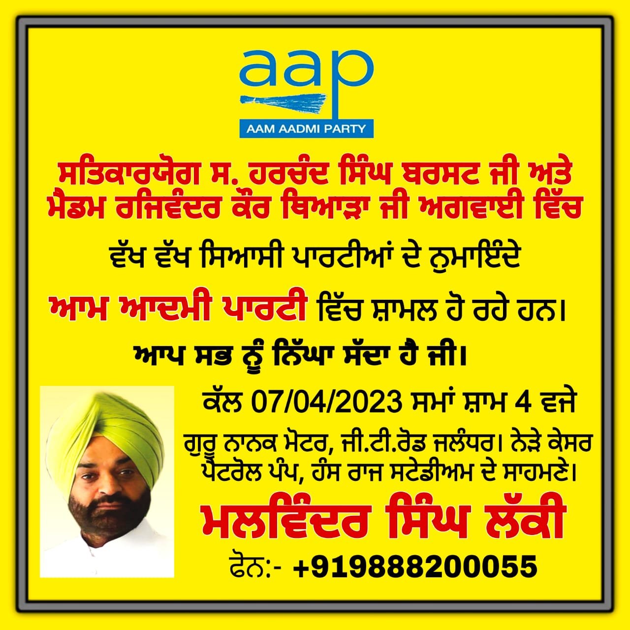 जालंधर (पंजाब दैनिक न्यूज़) जालंधर के कांग्रेसी विधायक सुशील रिंकू द्वारा आम आदमी पार्टी का हाथ थमने के बाद आम आदमी पार्टी में शामिल होने के लिए लोगों का तांता लगना शुरू हो गया है,ऐसा ही एक दृश्य कल कांग्रेस छोड़कर आम आदमी पार्टी में शामिल हुए मलविंदर सिंह लक्की के ऑफिस में देखने को मिलेगा क्योंकि कल गुरु नानक मोटर नजदीक केसर पेट्रोल पंप के नजदीक मलविंदर लक्की द्वारा बीजेपी,अकाली दल और कांग्रेस को बड़ा झटका देने जा रहे हैं जिसमें सैकड़ों पार्टी वर्करों को आम आदमी पार्टी में शामिल करवाएंगे जिसमें चेयरमैन मंडी बोर्ड हरचरण सिंह बरसड, राजवीर कौर व मलविंदर सिंह लक्की के नेतृत्व में सैकड़ों कार्यकर्ता में पार्टी में शामिल करेंगे। लोकसभा के उम्मीदवार सुशील रिंकू, विधायक शीतल अंगुराल, विधायक करतारपुर बलकार सिंह,विधायक रमन अरोड़ा मुख्य रूप पर पहुंचकर सैकड़ों वर्करों को पार्टी में शामिल करवाने पहुंचेंगे। जानकारी देते हुए बलविंदर सिंह लक्की ने बताया कि जब वह कांग्रेस लेबर सेल के को चेयरमैन थे उस दौरान इन्होंने सैकड़ों कांग्रेसी वर्करों को अपने पार्टी में शामिल करवाया था लेकिन जब यह पार्टी छोड़कर आम आदमी पार्टी ज्वाइन की तब से यह सारे वर्कर आम आदमी पार्टी में शामिल होने जा रहे हैं। गौरतलब है कि कांग्रेस पार्टी में भी एक्टिव नेता थे और आप पार्टी में आने के बाद अपनी गतिविधियां बढ़ा दी है और ज्यादा से ज्यादा लोगों को आम आदमी पार्टी से जोड़ने का प्रयास करें I