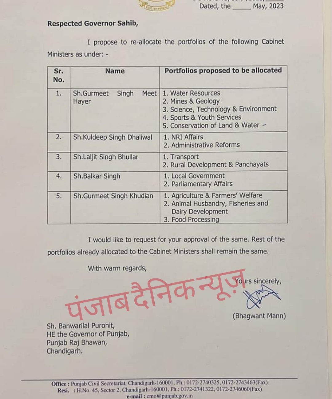 चंडीगढ़ (पंजाब दैनिक न्यूज़ )जालंधर-करतारपुर के विधायक बलकार सिंह बने मंत्री, कई मंत्रियों के विभागों में फेरबदल,लिस्ट देखें