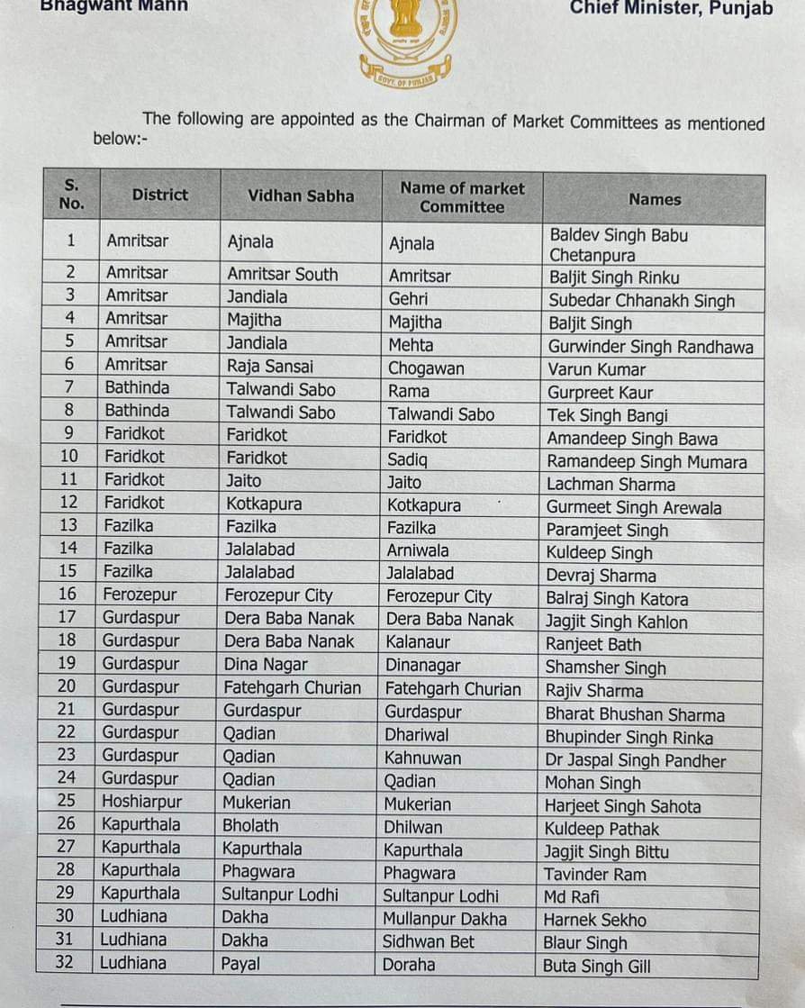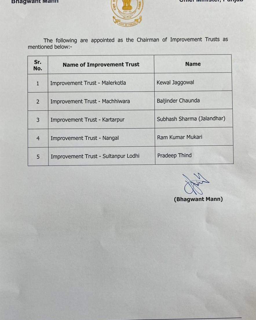 चंडीगढ़ (पंजाब दैनिक न्यूज़) पंजाब सरकार ने इंप्रूवमेंट ट्रस्ट करतारपुर के सुभाष शर्मा सहित 5 तथा मार्किट कमेटी के 66 नए चेयरमैन लगाए,लिस्ट देखें