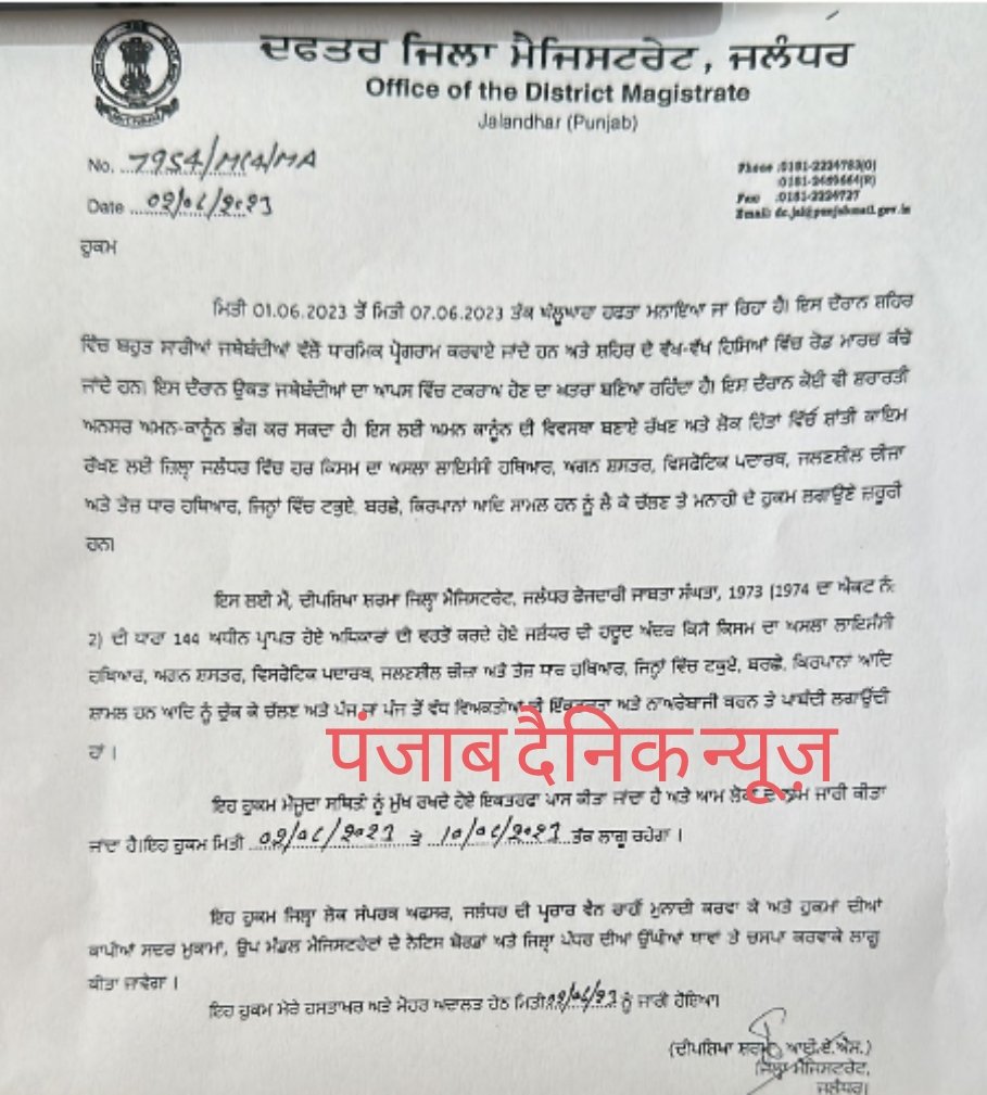 जालंधर Punjab Dainik News ) ऑपरेशन ब्लूस्टार की 39वीं बरसी को लेक जिला मैजिस्ट्रेट दीप शिखा ने जिले में 2 जून से लेकर 10 जून तक धारा 144 लागू करने का फैसला किया है। यह फैसला जिलें में लॉ एंड ऑर्डर और शांति को बनाए रखने के लिए किया गया है।जिला मैजिस्ट्रैट ने यह भी आदेश दिए हैं कि इस बीच तेजधार हथियार, पिस्तौल, असलाह लाइसैंस सहित अन्य हथियारों को चलाने की मनाही के आदेश भी जारी किए गए है।दरअसल 1 जून से 7 जून तक घल्लू घारे का सप्ताह मनाया जा रहा है। इस दौरान शहर में कई जत्थेबंदियों के द्वारा धार्मिक प्रोग्राम करवाए जा रहे है। जिसमें कुछ शरारती अनंसर अमन कानून को भंग कर सकते है। इसलिए ही जिला मैजिस्ट्रेट ने यह आदेश जारी किए हैं।