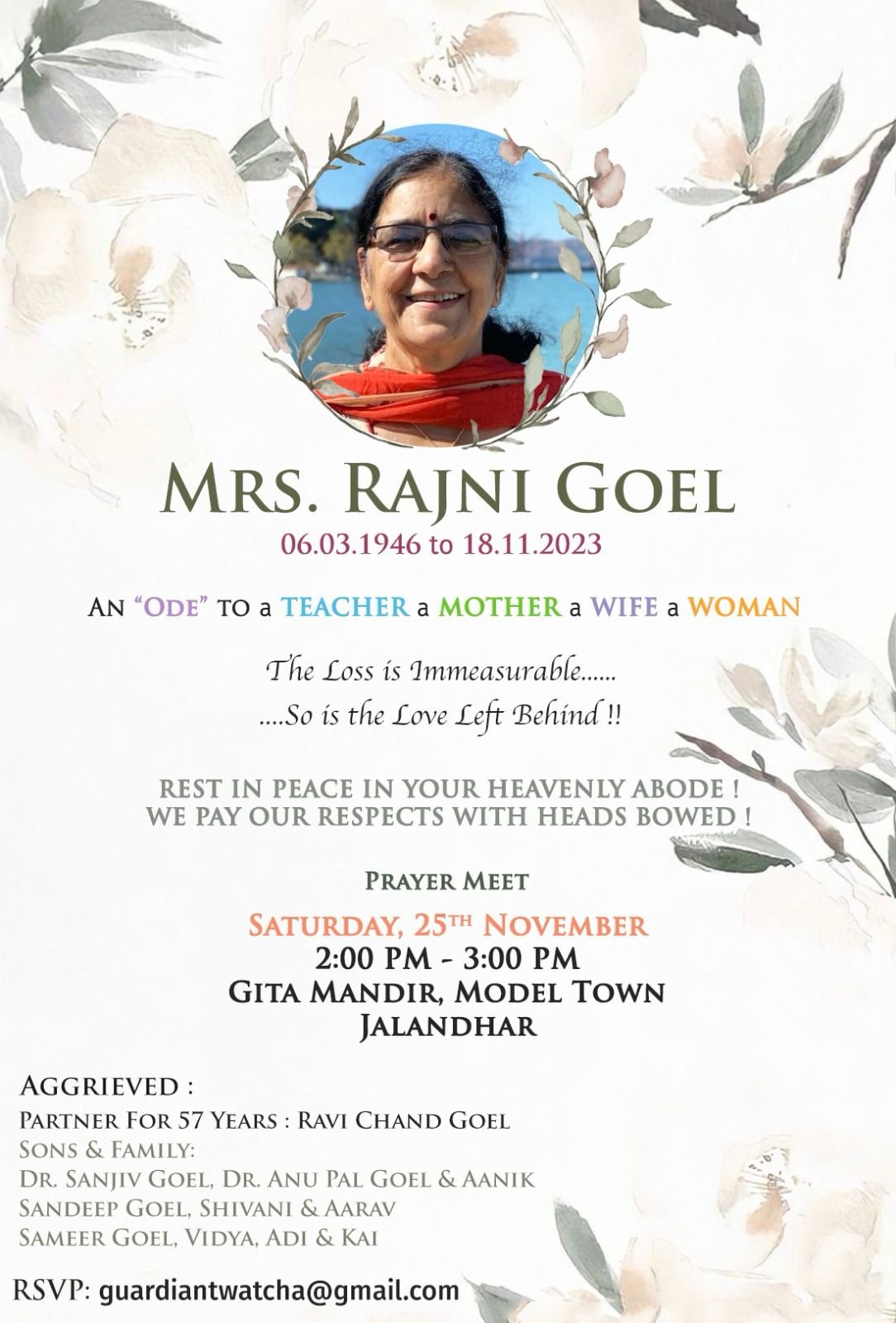 जालंधर पंजाब दैनिक न्यूज़ (मुनीष तोखी) हड्डियों के जाने-माने गार्डियन अस्पताल के प्रसिद्ध डॉ संजीव गोयल की पूज्यनीय माता श्रीमति रजनी गोयल जी अपनी सांसारिक यात्रा पूरी करके दिनांक 18 नवंबर को प्रभु चरणों में विलीन हो गई है। उनकी आत्म शांति के लिए रस्म पगड़ी व शोकसभा 25 नवंबर दिन शनिवार को गीता मंदिर माडल टाउन में 2 से 3 बजे सम्पन्न होगी।