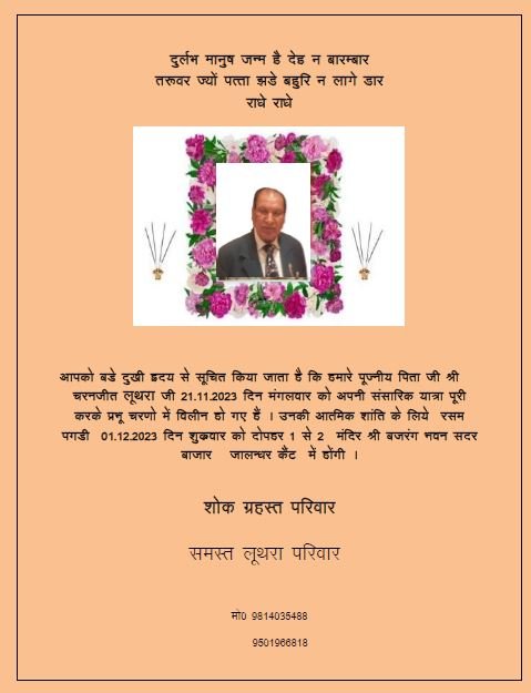 जालंधर कैंट (पंजाब दैनिक न्यूज़ ) जालंधर कैंट निवासी विपिन लूथरा के पिता स्व.चरनजीत लूथरा 21.11.2023 दिन मंगलवार को अपनी संसारिक यात्रा पूरी करके प्रभू चरणो में विलीन हो गए हैं। उनकी आतमिक शांति के लिये अंतिम अरदास और रस्म पगडी 1 दिसंबर दिन शुक्रवार को दोपहर 1 से 2 मंदिर श्री बजरंग भवन सदर बाजार जालन्धर कैंट में होंगी। इस दुख की घड़ी में राजनीतिक,धार्मिक और सामाजिक लोगों ने विपिन लूथरा के साथ संवेदना व्यक्त की I
