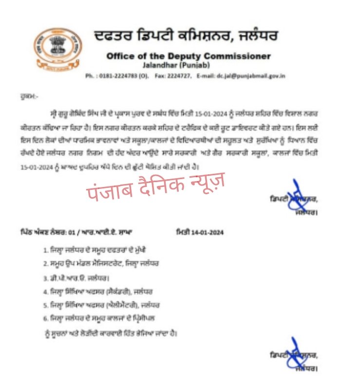 जालंधर (पंजाब दैनिक न्यूज़) जालंधर के डिप्टी कमिश्नर ने निकाले आदेश सोमवार को स्कूलों व कालेजों में रहेगी आधे दिन की छुट्टी आदेश पढ़े,
