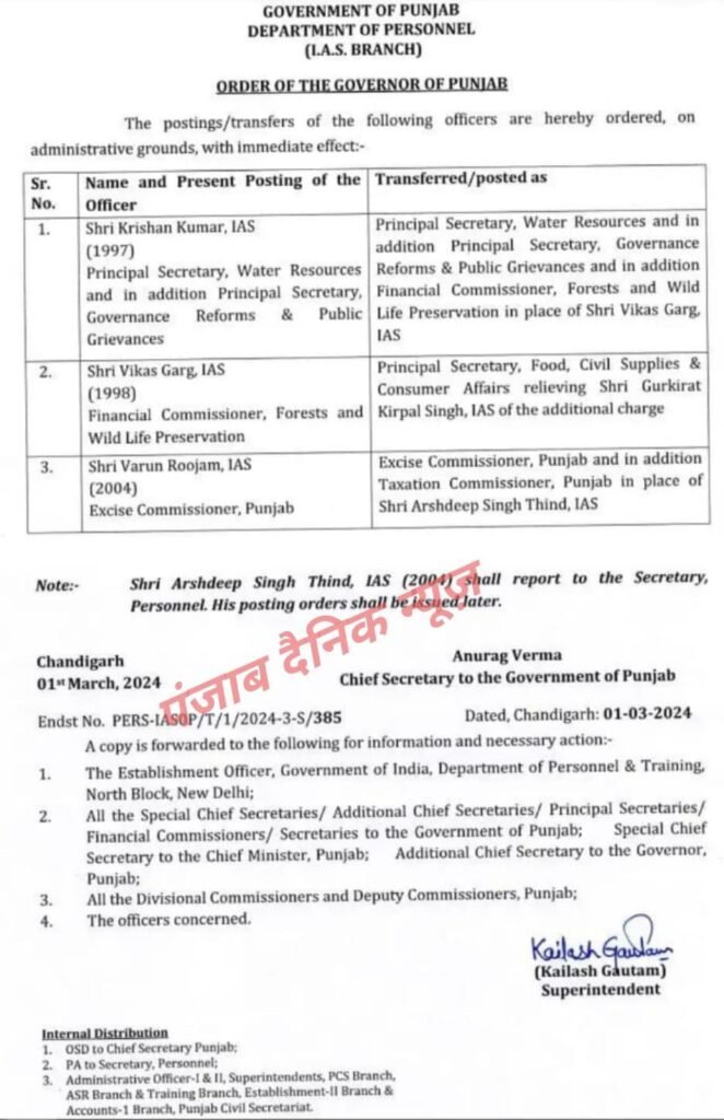 चंडीगढ़ (पंजाब दैनिक न्यूज़ ) पंजाब में IAS अधिकारियों के हुए तबादले, कृष्ण कुमार और वरुण रूजम को मिली यह जिम्मेदारी