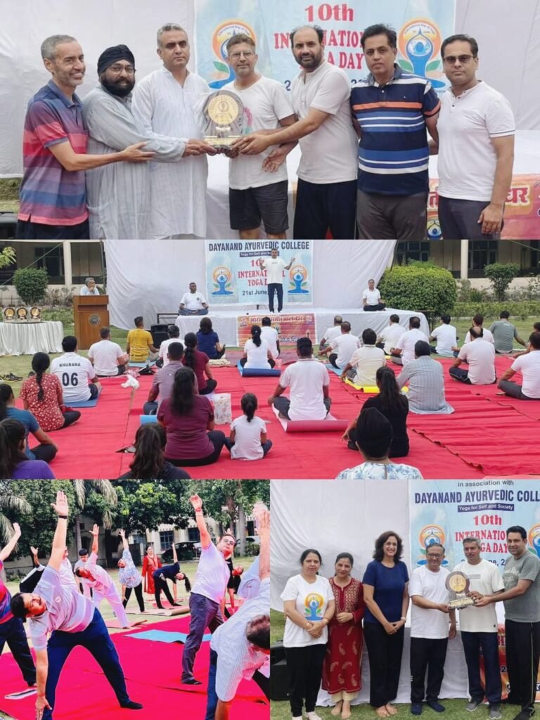 जालंधर पंजाब दैनिक न्यूज़ (मुनीष तोखी) भारत सहित विश्व के कई देशों में 21 जून को हर साल अंतर्राष्ट्रीय योग दिवस मनाया जाता है। इसी तरह पंजाब में भी अंतरराष्ट्रीय योग दिवस धूमधाम से मनाया जा रहा है। जिला मुख्यालयों पर विभिन्न संस्थाओं की ओर से योग शिविर लगाए गए, जिनमें लोगों ने बढ़-चढ़कर हिस्सा लिया। इसी कड़ी के अंतर्गत नीमा जालंधर की तरफ से DAV आयुर्वैदिक कॉलेज में 10वां अंतर्राष्ट्रीय योग दिवस जालंधर नीमा प्रधान डॉ. सतवीर सिंह की अध्यक्षता में बड़ी धूमधाम से मनाया गया I जो गुरुओं द्वारा नीमा सदस्यों को योग क्रियाएं करवाई गई, योग आरंभ से पहले डॉ. सतवीर सिंह ने योग को पूरे विश्व में फैलने के लिए प्रधानमंत्री नरेंद्र मोदी और योग गुरुओं का धन्यवाद व्यक्त किया I नीमा प्रदेश अध्यक्ष डॉ. परमिन्द्र बजाज ने आए हुए सभी सदस्यों का धन्यवाद व्यक्त किया और और नीमा सदस्यों को सभी त्योहार मिलजुल कर बनाने के लिए प्रेरित किया I