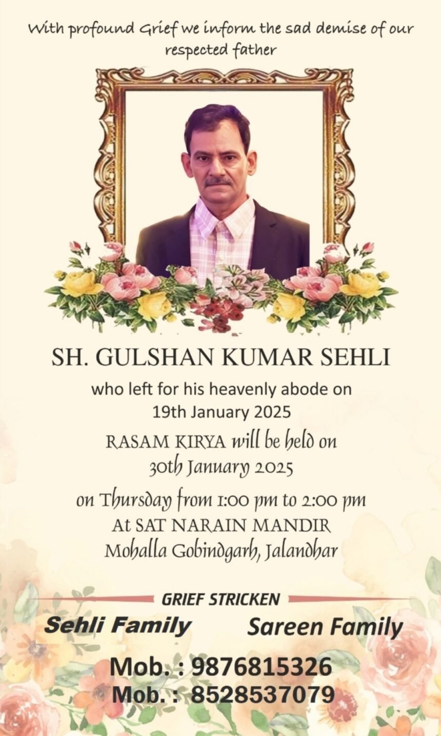 जालंधर (पंजाब दैनिक न्यूज़) स्वर्गीय गुलशन कुमार सेहली जो गत 19 जनवरी को स्वर्ग सिधार गए थे, उनकी आत्मिक शांति के लिए उनकी रस्म क्रिया 30 जनवरी 2025 गुरुवार को दोपहर 1:00 बजे से 2:00 बजे तक सत्यनारायण मंदिर मोहल्ला गोबिंदगढ़ जालंधर में संपन्न होगी I