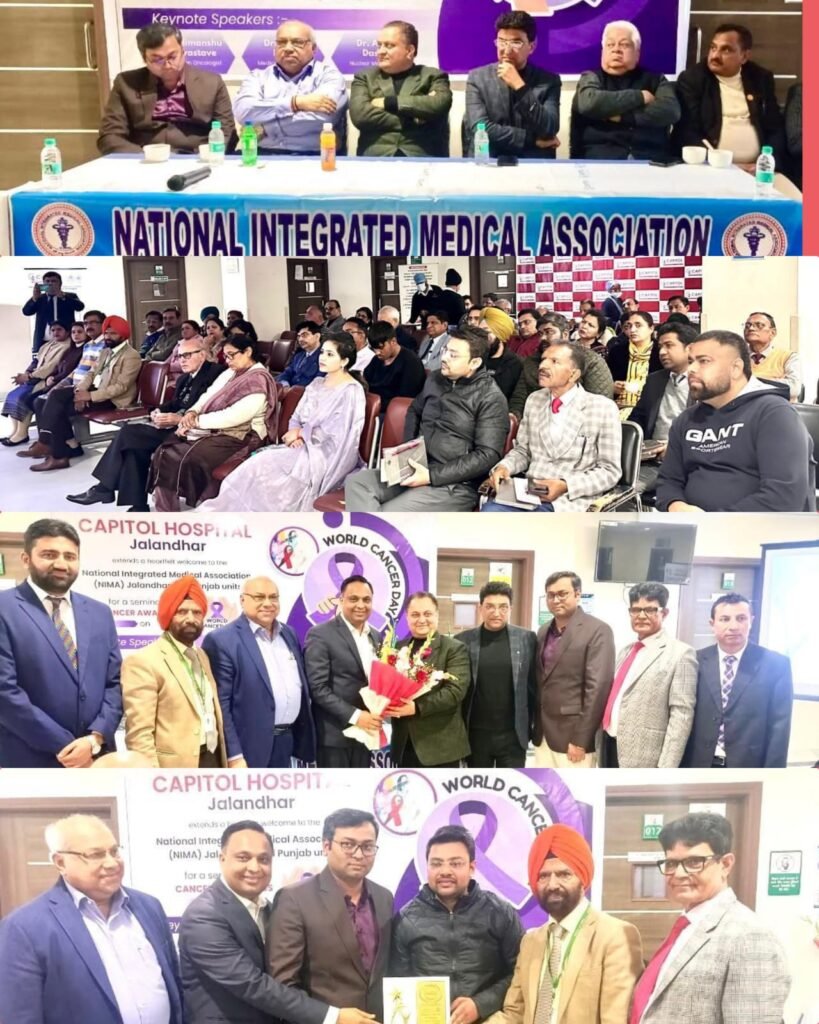 जालंधर पंजाब दैनिक न्यूज़ (मुनीष तोखी) नैशनल इंटीग्रेटिड मैडीकल एसोसिएशन (नीमा) की लोकल इकाई ने कैपिटल हॉस्पिटल के सहयोग से अंतरराष्ट्रीय कैंसर दिवस मनाया गया I जिसकी अध्यक्षता डॉ. एस पी डालिया ने की, इस मौके पर शहर के जाने माने कैसर रोग के विशेषज्ञयो ने भाग लिया और उपस्थित सदस्यों तथा जनसाधारण को इस भयानक बीमारी के बारे अवगत कराया संगोष्ठी की शुरुआत श्री धन्वंतरि पूजन और गैस्ट स्पीर्क्स की जान पहचान के साथ हुई । सर्व प्रथम Radiation Onchology के विशेषज्ञ डा. हिमांशु श्रीवास्तव ने कैंसर के मरीज़ों के जीवन में सुधार के अत्याधुनिक प्रणाली के बारे में विस्तार से बताया और कहा के विज्ञान ने इतनी तरक़्क़ी के कारण मरीज़ों का जीवन स्तर काफ़ी अच्छा रहने लगा है जबकि आज से कुछ वर्ष पहले उनकी हालत बहूत ही दयनीय होती थी बाद में विज्ञान के क्षेत्र में लगातार अनुसंधान के चलते हैं वो हालात अब नहीं रहे। इसके बाद डॉक्टर अर्जुन राजा ने बच्चों और बड़ों के कैंसर के क्षेत्र में नयी उपलब्धियों के बारे में सदस्यों को अवगत कराया कि आज के आधुनिक युग में साइंस ने बच्चों के कैंसर के उपचार की नई नई खोजों से काफ़ी सुविधा प्रदान की है,तदोपरांत Nuclear medicine के विशेषज्ञ डॉक्टर ए के दास ने कैंसर के जल्दी निदान के क्षेत्र में कुछ नवीनतम विधियों से के बारे में अवगत कराया की कैसे नई नई तकनीकों और आधुनिकतम मशीनों से जल्दी कैंसर को पकड़ सकते हैं और उनका चिकित्सा समयानुसार कार के मरीज़ की जान और पैसा बचा सकते हैं I इसके बाद उपस्थित विशेषज्ञों ने आए हुए नीमा सदस्यों के प्रश्नों का विस्तार से उत्तर दिया I इसके साथ ही संगोष्ठी के आखिर में डा. डालिया ने सभी नीमा सदस्यों का तथा अस्पताल के तीनों गैस्ट स्पीर्क्स की ओर से उनके साथ अहम जानकारी साझा करने पर उनको स्मृति चिह्न देकर सम्मानित किया I डॉ. राजीव धवन,डॉ.वरुण अग्रवाल,डॉ.परविंदर बजाज,डॉ.अनिल नागरथ, डॉ.मुकेश वालिया,डॉ.विपुल कक्कर, डॉ. विशाल भनोट K S राणा,दयाल अरोड़ा,महिंदर निर्मल, डॉ.रीना कक्कर, डॉ.अनु कक्कर, डॉ.सुनीता यादव, डॉ. अविनाश गुप्ता,डॉ. सुरिंदर कल्याण, डॉ. सुमित कल्याण भी उपस्थित थे ।