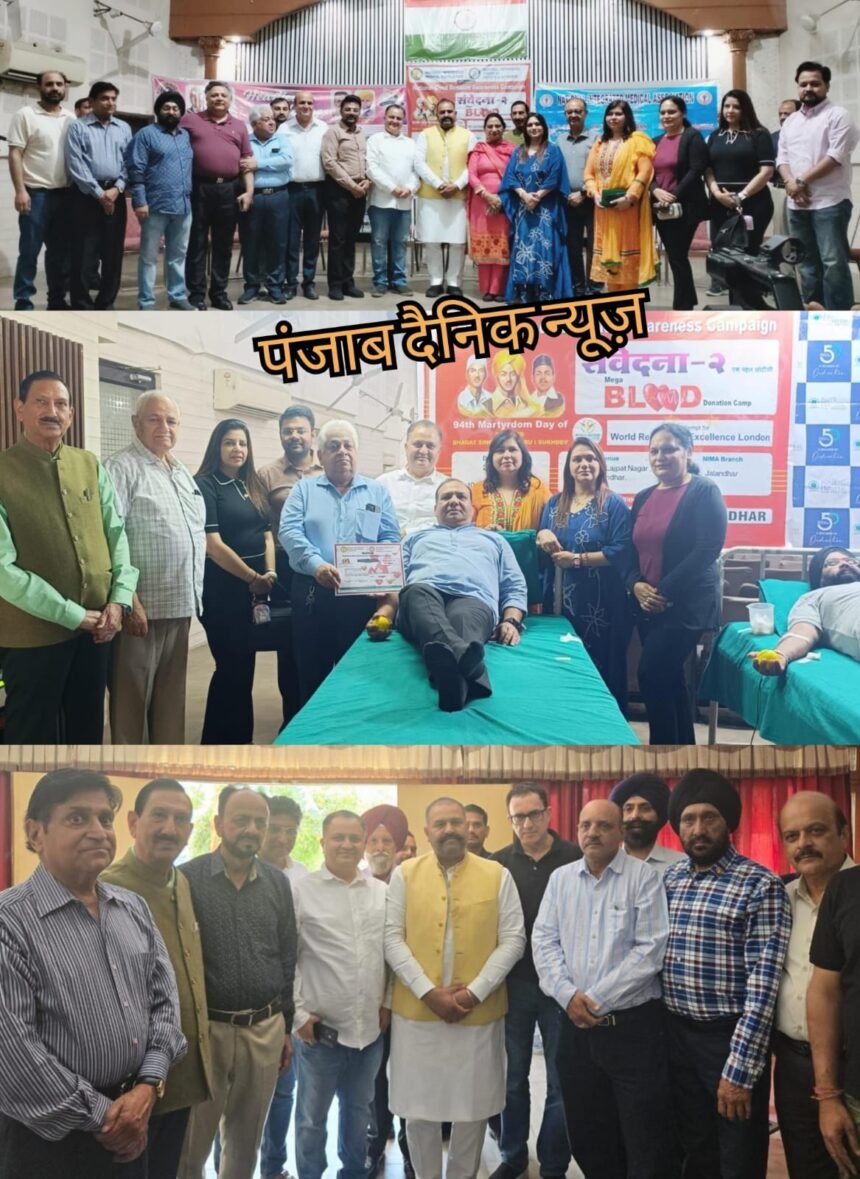 जालंधर पंजाब दैनिक न्यूज़ (मुनीष तोखी) शहीद ए आज़म भगत सिंह,सुखदेव तथा राजगुरु के बलिदान दिवस पर नीमा जालंधर ने लायंस क्लब के सहयोग से रक्तदान शिविर का आयोजन लायंस क्लब भवन लाजपत नगर में किया गया I जिसमें पूर्व सांसद सुशील रिंकू मुख्य मेहमान के तौर पर शामिल हुए I इस शिवर के प्रोजेक्ट डायरेक्टर नीमा पंजाब के उपाध्यक्ष डॉ अमरजीत सैनी ने बताया कि इस विशेष शिविर में लगभग 70 लोगों ने स्वेच्छा से रक्तदान किया,रिंकू ने सभी रक्तदान करने वालों तथा आयोजकों को बधाई देते हुए आगे भी देश सेवा के कार्यों में बढ़ चढ़कर हिस्सा लेने के लिये प्रेरित किया और सभी रक्तदाताओं को सम्मानित किया I इसके साथ ही नीमा पंजाब के प्रधान डॉ. परविंदर बजाज ने बताया कि नीमा पूरे देश में दूसरी संस्थाओं के साथ मिलकर लगभग 2 लाख यूनिट रक्त एकत्रित करने का लक्ष्य लेकर चल रही है,इसके लिये देश के हर हिस्से में कैंप लगाकर लोगों को प्रेरित किया जा रहा है I अंत में नीमा जालंधर के प्रधान डॉ एस पी डालिया ने मुख्य अतिथि तथा सभी कार्यकर्ताओं का धन्यवाद किया और विश्वास दिलाया कि हम लोगों की सेवा के कभी भी कोई कसर नहीं छोड़ेंगे I इस अवसर पर डॉ. S P डालिया,डॉ. राजीव धवन,डॉ. वरुण अग्रवाल,डॉ. S S घहोत्रा,डॉ. अमरजीत सैनी,डॉ. परविंदर बजाज, डॉ. रीना कक्कर,डॉ. विशाल भनोट,डॉ. जसलीन सेठी, डॉ. I P सिंह सेठी,डॉ. पुनीत गौतम,डॉ. N K शर्मा,डॉ. P K गूगलानी,डॉ पवन पवन वशिष्ठ,डॉ मुकेश वालिया,डॉ. रीना मल्होत्रा सहित अन्य लोगो ने विशेष रूप से सहयोग दिया I प्रोजेक्ट डायरेक्टर डा.अमरजीत सैनी का नीमा ने धन्यवाद किया जिन्होने तन मन धन से खूनदान कैंप को सफल बनाया I