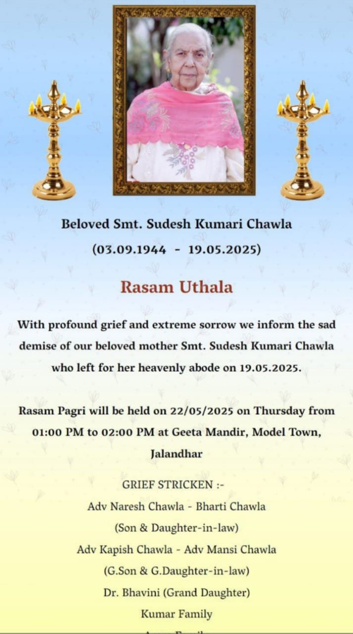 जालंधर (पंजाब दैनिक न्यूज़) अत्यंत दुखी हृदय के साथ सूचित किया जाता है कि एडवोकेट नरेश चावला की माता एवं एडवोकेट कपीश चावला की दादी जी श्रीमती सुदेश कुमारी चावला जो गत 19 मई को स्वर्ग सिधार गईं। उनकी रस्म उठाला 22 मई दिन गुरूवार को दोपहर 01:00 बजे से 02:00 बजे तक गीता मंदिर, मॉडल टाउन, जालंधर में होगी I