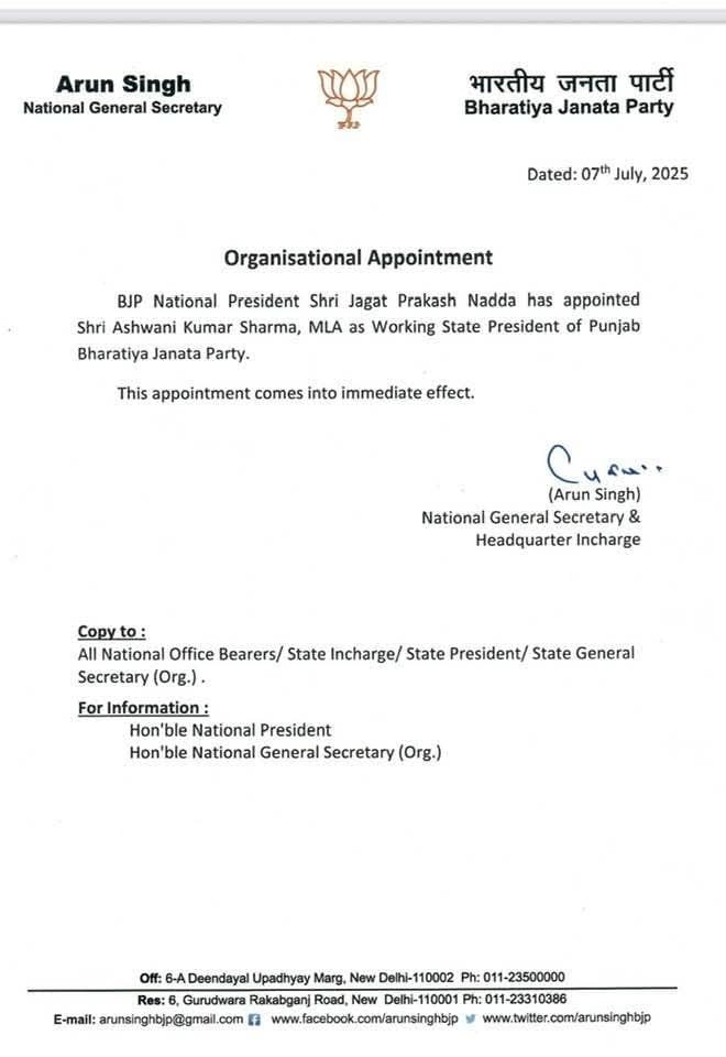 चंडीगढ़ (पंजाब दैनिक न्यूज़) भारतीय जनता पार्टी (BJP) के राष्ट्रीय अध्यक्ष जगत प्रकाश नड्डा ने सोमवार को संगठन में बड़ा फेरबदल किया है। उन्होंने विधायक अश्विनी कुमार शर्मा को तत्काल प्रभाव से पंजाब बीजेपी का कार्यकारी प्रदेश अध्यक्ष नियुक्त किया है। यह नियुक्ति तत्काल प्रभाव से लागू होगी। पार्टी में इस फेरबदल को आगामी चुनावों की तैयारी के रूप में देखा जा रहा है जिसमें अश्विनी कुमार शर्मा की भूमिका महत्वपूर्ण होगी यह खबर मिलते ही भाजपा कार्यकर्ताओं में भारी उत्साह देखने को मिल रहा है I सागर जॉर्ज प्रधान BJP मण्डल 17 जालंधर शहरी ने नव नियुक्त कार्यकारी प्रदेश अध्यक्ष अश्विनी कुमार शर्मा को बधाई दी I