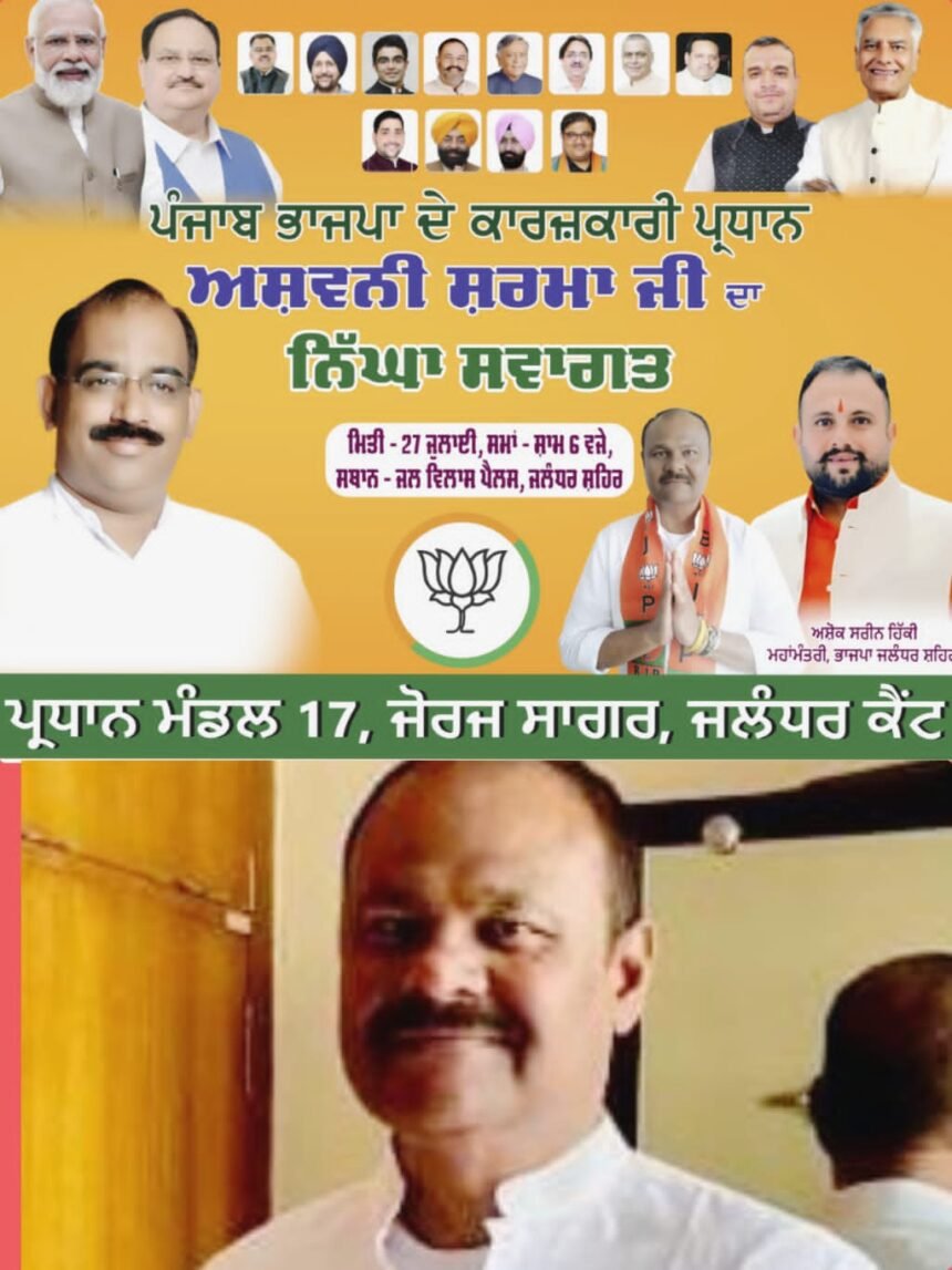 ਜਲੰਧਰ, 25 ਜੁਲਾਈ ਪੰਜਾਬ ਦੈਨਿਕ ਨਿਊਜ਼ (ਮੁਨੀਸ਼ ਤੋਖੀ) ਭਾਰਤੀ ਜਨਤਾ ਪਾਰਟੀ ਪੰਜਾਬ ਦੇ ਕਾਰਜਕਾਰੀ ਪ੍ਰਧਾਨ ਅਸ਼ਵਨੀ ਸ਼ਰਮਾ ਦੇ ਜਲੰਧਰ ਦੌਰੇ ਨੂੰ ਲੈ ਕੇ ਪਾਰਟੀ ਵਰਕਰਾਂ ਵਿਚ ਖਾਸਾ ਉਤਸ਼ਾਹ ਵੇਖਣ ਨੂੰ ਮਿਲ ਰਿਹਾ ਹੈ।ਜਲੰਧਰ ਕੈਂਟ ਮੰਡਲ-17 ਦੇ ਪ੍ਰਧਾਨ ਸਾਗਰ ਜਾਰਜ ਨੇ ਆਪਣੇ ਸੈਂਕੜੇ ਸਮਰਥਕਾਂ ਦੇ ਨਾਲ ਵਿਸ਼ੇਸ਼ ਤੌਰ ‘ਤੇ ਤਕਰੀਬਨ 30 ਟੈਪੋ ਟਰੈਵਲਰ ਵਾਹਨਾਂ ਦੇ ਕਾਫਲੇ ਦੇ ਰੂਪ ਵਿੱਚ ਵਰਕਸ਼ਾਪ ਚੌਕ ਨੇੜੇ ਸਥਿਤ ਜਲ ਵਿਲਾਸ ਭਵਨ ਵਿਖੇ ਪਹੁੰਚਣ ਦੀ ਯੋਜਨਾ ਬਣਾਈ ਹੈ, ਜਿਥੇ ਉਹ ਅਸ਼ਵਨੀ ਸ਼ਰਮਾ ਦਾ ਜੋਸ਼ੀਲਾ ਸਵਾਗਤ ਕਰਨਗੇ।ਮੰਡਲ-17 ਵਲੋਂ ਕੀਤੇ ਜਾ ਰਹੇ ਇਸ ਭव्य ਸਵਾਗਤ ਸਮਾਰੋਹ ਨੂੰ ਲੈ ਕੇ ਭਾਜਪਾ ਦੇ ਸਥਾਨਕ ਵਰਕਰਾਂ ਵਿਚ ਖੁਸ਼ੀ ਅਤੇ ਉਤਸ਼ਾਹ ਦਾ ਮਾਹੌਲ ਹੈ। ਪਾਰਟੀ ਸਰੋਤਾਂ ਮੁਤਾਬਕ ਅਸ਼ਵਨੀ ਸ਼ਰਮਾ ਆਪਣੇ ਇਸ ਦੌਰੇ ਦੌਰਾਨ ਆਉਣ ਵਾਲੀਆਂ ਵਿਧਾਨ ਸਭਾ ਚੋਣਾਂ ਦੀ ਰਣਨੀਤੀ ‘ਤੇ ਵੀ ਸਥਾਨਕ ਆਗੂਆਂ ਨਾਲ ਵਿਚਾਰ-ਵਟਾਂਦਰਾ ਕਰ ਸਕਦੇ ਹਨ।