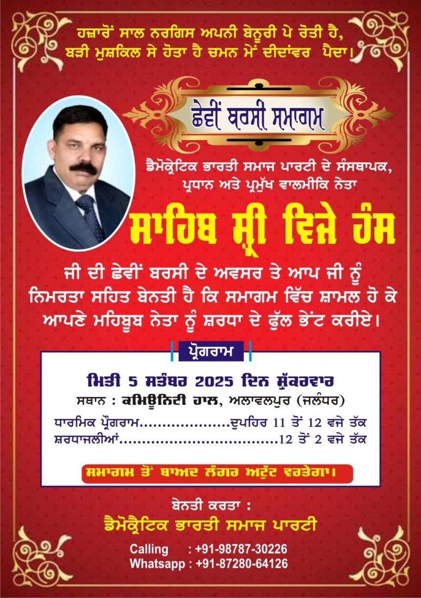 ਜਲੰਧਰ ਪੰਜਾਬ ਦੈਨਿਕ ਨਿਊਜ਼ (ਮੁਨੀਸ਼ ਤੋਖੀ) ਡੈਮੋਕ੍ਰੇਟਿਕ ਭਾਰਤੀ ਸਮਾਜ ਪਾਰਟੀ ਦੇ ਸੰਸਥਾਪਕ,ਪ੍ਰਧਾਨ ਅਤੇ ਪ੍ਰਮੁੱਖ ਵਾਲਮੀਕਿ ਨੇਤਾ ਸਾਹਿਬ ਸ੍ਰੀ ਵਿਜੇ ਹੰਸ ਦੀ 6ਵੀਂ ਬਰਸੀ ਦੇ ਅਵਸਰ ਤੇ ਮਿਤੀ 5 ਸਤੰਬਰ ਦਿਨ ਸ਼ੁੱਕਰਵਾਰ ਨੂੰ ਸ਼ਰਧਾਂਜਲੀ ਸਮਾਗਮ ਪਿੰਡ ਅਲਾਵਲਪੁਰ ਦੇ ਕਮਿਊਨਿਟੀ ਹਾਲ ਵਿਖੇ ਰੱਖਿਆ ਜਾ ਰਿਹਾ I ਇਹ ਜਾਣਕਾਰੀ ਡੈਮੋਕ੍ਰੇਟਿਕ ਭਾਰਤੀ ਸਮਾਜ ਪਾਰਟੀ ਦੇ ਰਾਸ਼ਟਰੀ ਪ੍ਰਧਾਨ ਰਜਿੰਦਰ ਗਿੱਲ ਨੇ ਪੰਜਾਬ ਦੈਨਿਕ ਨਿਊਜ਼ ਨਾਲ ਗੱਲ ਕਰਦੇ ਹੋਏ ਦਿੱਤੀ I ਗਿੱਲ ਨੇ ਦੱਸਿਆ ਕਿ ਹਰ ਸਾਲ ਦੀ ਤਰ੍ਹਾਂ ਇਸ ਸਾਲ ਵੀ ਪੰਜਾਬ ਦੇ ਪ੍ਰਸਿੱਧ ਗਾਇਕ ਦਲਵਿੰਦਰ ਦਿਆਲਪੁਰੀ ਅਤੇ ਵੀਰ ਜਸਵੀਰ ਪਾਰਸ ਵਿਸ਼ੇਸ਼ ਰੂਪ ਨਾਲ ਹਾਜ਼ਰੀ ਭਰਨਗੇ I ਉਹਨਾਂ ਸਭ ਨੂੰ ਅਪੀਲ ਕੀਤੀ ਸ਼ਰਧਾਂਜਲੀ ਸਮਾਗਮ ਵਿੱਚ ਸ਼ਾਮਲ ਹੋ ਕੇ ਆਪਣੇ ਮਹਿਬੂਬ ਨੇਤਾ ਨੂੰ ਸ਼ਰਧਾ ਦੇ ਫੁੱਲ ਭੇਂਟ ਕਰੀਏ। ਗਿੱਲ ਨੇ ਦੱਸਿਆ ਕਿ ਮਿਤੀ 5 ਸਤੰਬਰ ਦਿਨ ਸ਼ੁੱਕਰਵਾਰ ਸਥਾਨ,ਕਮਿਊਨਿਟੀ ਹਾਲ, ਅਲਾਵਲਪੁਰ (ਜਲੰਧਰ)ਧਾਰਮਿਕ,ਪ੍ਰੌਗਰਾਮ ਦੁਪਹਿਰ 11 ਤੋਂ 12 ਵਜੇ ਤੱਕ ਅਤੇ ਸ਼ਰਧਾਜਲੀਆਂ 12 ਤੋਂ 2 ਵਜੇ ਤੱਕ ਹੋਣਗੀਆਂ ई ਸਮਾਗਮ ਤੋਂ ਬਾਅਦ ਲੰਗਰ ਅਟੁੱਟ ਵਰਤੇਗਾ।