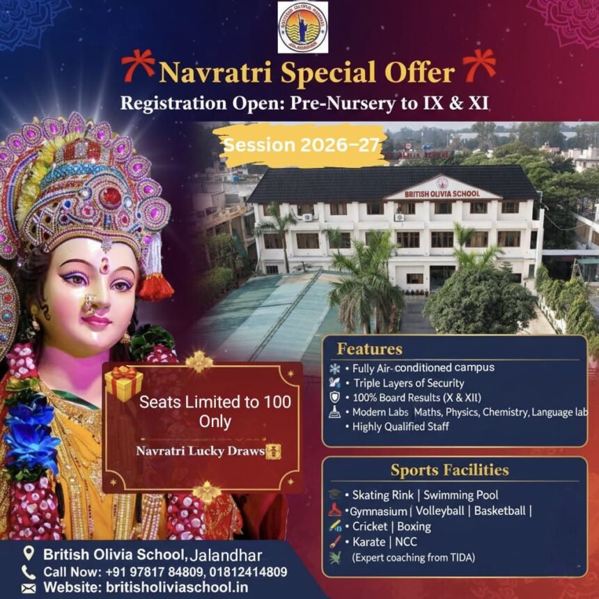 जालंधर पंजाब दैनिक न्यूज़ (मुनीष तोखी) ब्रिटिश ओलिविया स्कूल ने सत्र 2026-27 के लिए पंजीकरण शुरू कर दिया है, 100-150 सीटों में तेजी से पंजीकरण हुआ। ब्रिटिश ओलिविया स्कूल, जालंधर ने नवरात्रि के शुभ अवसर पर सत्र 2026-27 के लिए पंजीकरण शुरू कर दिया है। स्कूल की मैनेजमेंट ने बताया कि स्कूल में बच्चों की संख्या उत्कृष्ट है, जिसके कारण केवल 100 से 150 सीमित सीटें उपलब्ध हो पाती हैं। उन्होंने कहा कि ऑफ़र के पहले ही दिन दर्जनों अभिभावकों का उत्साह देखकर यह स्पष्ट हो गया कि विद्यालय ने अपनी मेहनत और शिक्षण गुणवत्ता से माता-पिता के दिलों में शिक्षा के महत्व की गहरी जगह बनाई है। हर वर्ष बड़ी संख्या में आवेदन आने के बावजूद सीमित सीटें कुछ ही दिनों में भर जाती हैं। नवरात्रि विशेष ऑफ़र के अंतर्गत प्रत्येक नए पंजीकरण पर लकी ड्रॉ के माध्यम से आकर्षक छूट दी जाएगी। पंजाब दैनिक न्यूज़ से बात करते हुए स्कूल मैनेजमेंट ने बताया कि हमारा उद्देश्य शिक्षा को केवल किताबों तक सीमित न रखकर बच्चों के सर्वांगीण विकास पर केंद्रित करना है। इसी दृष्टिकोण के तहत ब्रिटिश ओलिविया स्कूल ने आधुनिक सुविधाएँ, समृद्ध वातावरण और विशेषज्ञ शिक्षकों के साथ-साथ खेल, कला, संगीत और सह-पाठ्यक्रम गतिविधियाँ उपलब्ध करवाई हैं। विद्यालय पूरी तरह से एयर-कंडीशन्ड और वाई-फाई से लैस है, जिसमें तीन स्तरीय सुरक्षा व्यवस्था और ट्रांसपोर्ट में जीपीएस सुविधा बच्चों के सुरक्षित और आरामदायक वातावरण को सुनिश्चित करती है। स्कूल में सेकेंडरी और सीनियर सेकेंडरी में 100% बोर्ड परिणाम के साथ गणित,भौतिकी,रसायन,जीवविज्ञान प्रयोगशाला और भाषा प्रयोगशालाएँ हैं जो विद्यार्थियों को प्रैक्टिकल शिक्षा और विषयों की गहन समझ प्रदान करती हैं। इसके अलावा,खेल फर्श को सिंथेटिक करवाया गया है, स्विमिंग पूल,स्केटिंग रिंक, जिम्नेज़ियम,क्रिकेट, बास्केटबॉल,वॉलीबॉल, बैडमिंटन,बॉक्सिंग, कराटे, नृत्य, संगीत,कला और एनसीसी जैसी खेल गतिविधियाँ विशेषज्ञ कोच के देखरेख में होती हैं, जिससे नेतृत्व क्षमता और टीम भावना मजबूत होती हैं। विद्यालय में केवल शैक्षणिक उत्कृष्टता ही नहीं बल्कि बच्चों के व्यक्तित्व और सर्वांगीण विकास पर भी विशेष ध्यान दिया जाता है। वाद-विवाद, सांस्कृतिक कार्यक्रम, कला एवं संगीत प्रतियोगिताएँ, ट्रॉफियाँ और मेडल्स बच्चों में आत्मविश्वास और प्रतिस्पर्धात्मक भावना को प्रोत्साहित करती हैं। हमारा लक्ष्य एक संतुलित और पूर्ण विकसित व्यक्ति तैयार करना है, जो जीवन की विभिन्न चुनौतियों का सामना करने में सक्षम हो।अभिभावक ब्रिटिश ओलिविया स्कूल, जालंधर से संपर्क कर सकते हैं – 97817 84809, 0181-2414809। अधिक जानकारी के लिए वेबसाइट देखें: britisholiviaschool.in
