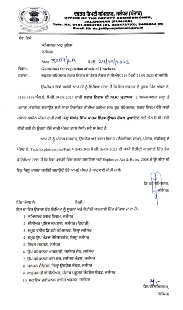 जालंधर पंजाब दैनिक न्यूज़ (मुनीष तोखी) पिछले लंबे समय से जालंधर में लगने वाली पटाखा मार्केट के बारे में रोज नहीं खबर सामने आती है जालंधर के नकोदर रोड पर खालसा स्कूल तथा लम्मा पिंड चौक चारा मंडी में पटाखा मार्केट लगाने की भले ही NOC दी गई थी परंतु वहां पर पटाखा लगाने के लिए मार्केट सुरक्षित ना होने को लेकर अब दोनों जगह को छोड़कर नगर निगम कमिश्नर की ओर से जारी पत्र में जालंधर के बेअंत सिंह पार्क इंडस्ट्री एरिया फोकल प्वाइंट में मार्किट लगाने को लेकर प्रशासन ने एनओसी पत्र जारी कर दिया है।
