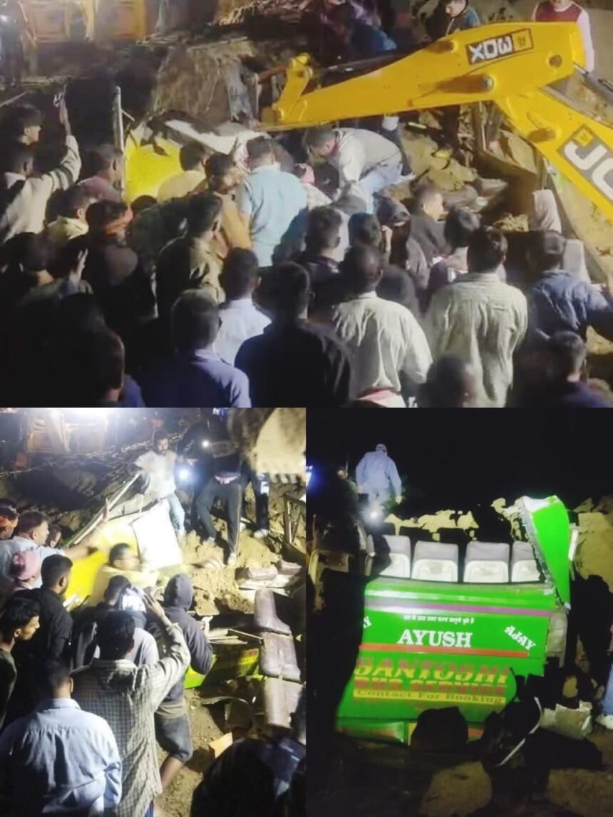 हिमाचल प्रदेश (पंजाब दैनिक न्यूज़) हिमाचल प्रदेश के बिलासपुर ज़िले में मंगलवार रात एक बड़ा हादसा हो गया। भल्लू पुल पर पहाड़ी से गिरे मलबे की चपेट में एक बस आ गई। बस में सवार 18 यात्रियों की मौके पर ही मौत हो गई, जबकि कई अन्य गंभीर रूप से घायल हो गए। हादसा होते देख स्थानीय लोग मौके पर पहुँचे और बचाव कार्य शुरू किया। बताया जा रहा है कि बस में करीब 30 यात्री सवार थे। पुलिस और प्रशासन की टीमें भी मौके पर पहुँच गई हैं। जेसीबी की मदद से मलबा हटाया जा रहा है।