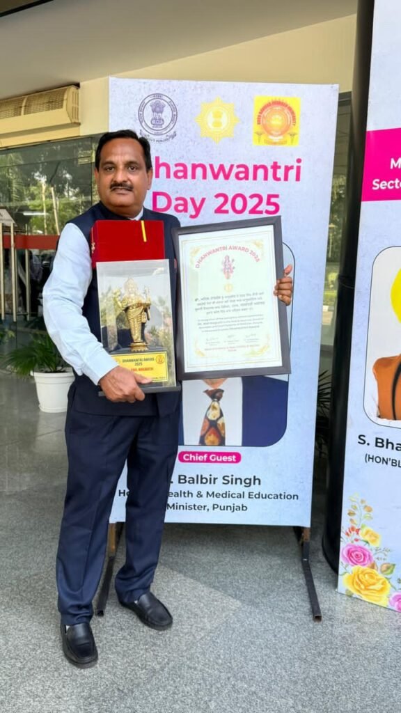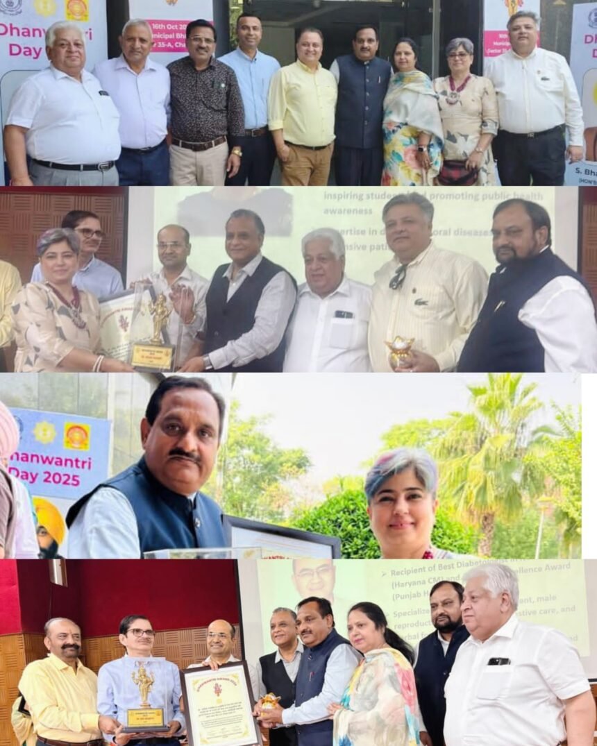 चंडीगढ़ (पंजाब दैनिक न्यूज़) आज यहाँ चंडीगढ़ में भगवान धन्वंतरि दिवस के उपलक्ष्य में आयोजित समारोह जालंधर के लिये शुभ रहा जब यहाँ पूरे प्रदेश से आये डेलिगेटस के बीच जालंधर के डॉ अनिल नागरथ और डॉ मीनू भनोट को स्वास्थ्य के क्षेत्र में अपने उत्कृष्ट योगदान के लिए भगवान धन्वंतरि पुरस्कार से सम्मानित किया गया, दर्शकों से भरे हाल में मुख्यातीथी प्रिंसिपल सेक्रेटरी हैल्थ मि॰ कुमार राहुल जी ने इनको पुरस्कार देते हुये चिकित्सा क्षेत्र में आयुर्वेद की भूमिका पर भरपूर सराहना की इसी मौक़े पर गुरू रविदास युनिवर्सिटी के वाइस चांसलर डॉ संजीव सूद तथा पंजाब आयुर्वेदिक &युनानी बोर्ड के रजिस्ट्रार डाक्टर संजीव गोयल विशेष अतिथि के रूप में उपस्थित रहे I इस अवसर पर नीमा राष्ट्रीय के महासचिव तथा नीमा पंजाब के प्रधान डॉ परविंदर बजाज पंजाब बोर्ड सदस्य डॉ आई पी एस सेठी राष्ट्रीय स्पेक्स पर्सन डॉ विशाल भनोट जालंधर नीमा प्रधान डाक्टर एस पी डालिया के इलावा डॉ पवन विशिष्ट डॉ आशू चोपड़ा डॉ सतबीर डॉ सुनीता नागरथ आदि उपस्थित थे I वहीं पर जालंधर पधारने पर नीमा जालंधर नीमा ने दोनों विजेताओं का गर्मजोशी से स्वागत किया और उनके उज्ज्वल भविष्य की शुभकामनाएँ दीं