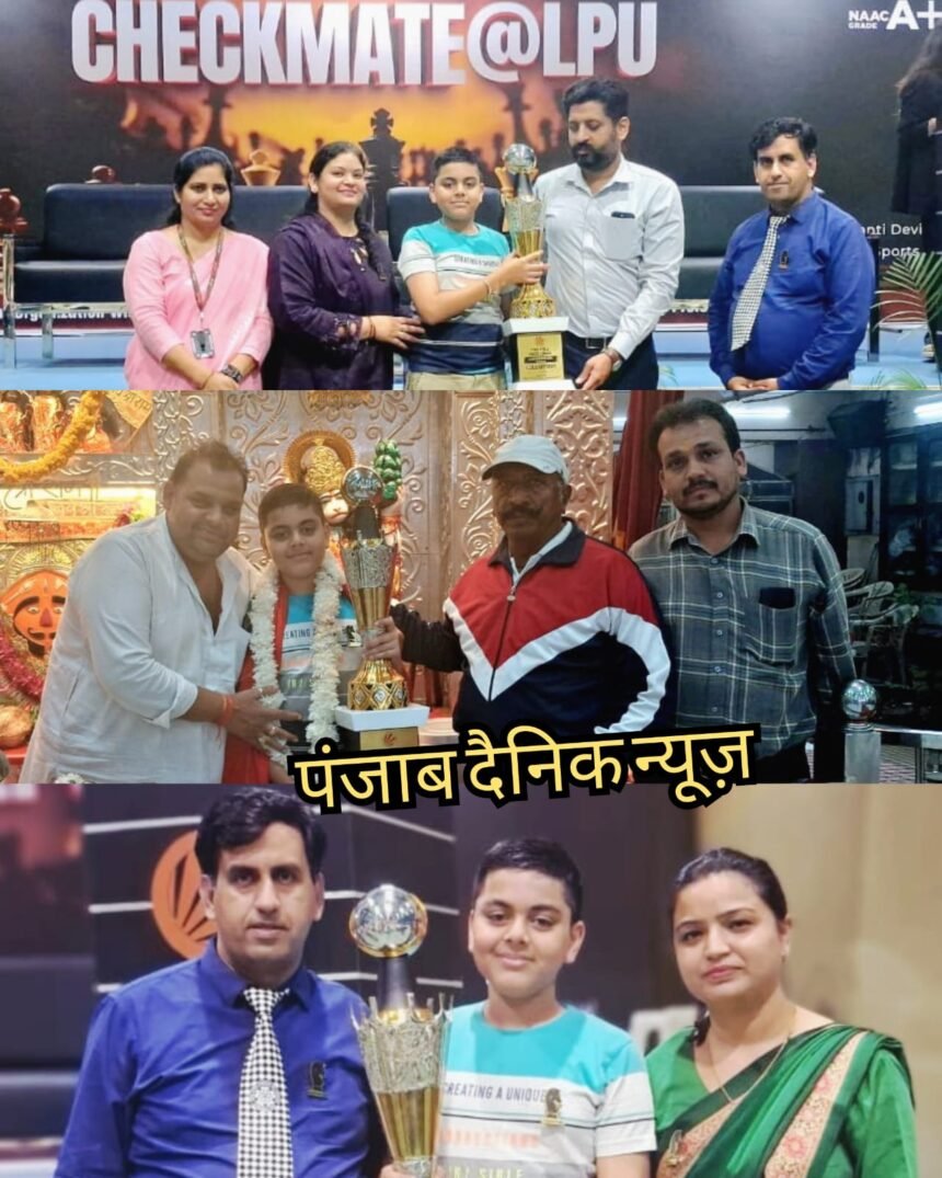 जालंधर पंजाब दैनिक न्यूज़ (मुनीष तोखी) जालंधर के प्रतिभाशाली बाल शतरंज खिलाड़ी श्रेयांश जैन, उम्र मात्र 12 वर्ष, ने एक बार फिर अपनी अद्भुत खेल क्षमता का प्रदर्शन करते हुए चेकमेट @ LPU ओपन Freestyle Chess 960 टूर्नामेंट 2025 में प्रथम स्थान हासिल किया।यह प्रतिष्ठित प्रतियोगिता लवली प्रोफेशनल यूनिवर्सिटी (LPU), जालंधर में आयोजित की गई थी, जिसमें पूरे भारत से विभिन्न आयु वर्गों के खिलाड़ियों ने भाग लिया। यह एक ओपन कैटेगरी प्रतियोगिता थी, जिसमें किसी भी उम्र के खिलाड़ी हिस्सा ले सकते थे। अनुभवी खिलाड़ियों के बीच श्रेयांश का शीर्ष स्थान हासिल करना उनकी गहरी सोच, सटीक रणनीति और आत्मविश्वास का परिचायक है। पुरस्कार विजेता के रूप में श्रेयांश को आकर्षक ट्रॉफी से सम्मानित किया गया। उल्लेखनीय है कि श्रेयांश जैन का चयन हाल ही में 50th नेशनल Sub-Junior (Under-15) ओपन चैस चैंपियनशिप 2025 के लिए भी हुआ है, जहाँ वे पंजाब राज्य का प्रतिनिधित्व करेंगे। यह उपलब्धि जालंधर के लिए भी गौरव का विषय है। इनोसेंट हार्ट स्कूल जालंधर जहाँ श्रेयांश अध्ययनरत हैं, ने इस सफलता पर गर्व व्यक्त किया। स्कूल प्रशासन ने कहा कि “श्रेयांश न केवल पढ़ाई में उत्कृष्ट हैं, बल्कि खेल और अन्य सह-पाठयक्रम गतिविधियों में भी लगातार नई ऊँचाइयाँ छू रहे हैं। उनका समर्पण अन्य विद्यार्थियों के लिए प्रेरणास्रोत है।” इस अवसर पर जालंधर कैंट स्थित मंदिर श्री बजरंग भवन के प्रधान भूषण अग्रवाल ‘भूषी’ ने भी श्रेयांश जैन को हार्दिक शुभकामनाएँ देते हुए उनके उज्ज्वल भविष्य की कामना की। श्रेयांश जैन की यह सफलता इस बात का उदाहरण है कि दृढ़ निश्चय और निरंतर अभ्यास से उम्र कोई सीमा नहीं होती। उनकी यह उपलब्धि आने वाली पीढ़ी के लिए प्रेरणा बनकर उभरेगी।