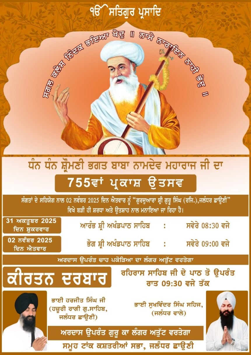 ਜਲੰਧਰ ਛਾਉਣੀ / ਪੰਜਾਬ ਦੈਨਿਕ ਨਿਊਜ਼ (ਮੁਨੀਸ਼ ਤੋਖੀ) ਧੰਨ ਧੰਨ ਸ਼੍ਰੋਮਣੀ ਭਗਤ ਬਾਬਾ ਨਾਮਦੇਵ ਮਹਾਰਾਜ ਜੀ ਦਾ 755ਵਾਂ ਪ੍ਰਕਾਸ਼ ਉਤਸਵ ਸਮੂਹ ਟਾਂਕ ਕਸ਼ਤਰੀਆਂ ਸਭਾ ਵੱਲੋਂ (ਅੱਜ) 2 ਨਵੰਬਰ ਦਿਨ ਐਤਵਾਰ ਨੂੰ ਗੁਰਦੁਆਰਾ ਸ਼੍ਰੀ ਗੁਰੂ ਸਿੰਘ (ਰਜਿ.) ਜਲੰਧਰ ਛਾਉਣੀ ਵਿਖੇ ਬੜੀ ਹੀ ਸ਼ਰਧਾ ਅਤੇ ਉਤਸ਼ਾਹ ਨਾਲ ਮਨਾਇਆ ਜਾ ਰਿਹਾ ਹੈ,ਅੱਜ ਦਿਨ ਐਤਵਾਰ ਨੂੰ ਭੋਗ ਸ਼੍ਰੀ ਅਖੰਡਪਾਠ ਸਾਹਿਬ ਤੋਂ ਬਾਅਦ ਰਾਤ 9:30 ਵਜੇ ਤੱਕ ਭਾਈ ਹਰਜੀਤ ਸਿੰਘ ਜੀ (ਹਜ਼ੂਰੀ ਰਾਗੀ ਗੁ.ਸਾਹਿਬ, ਜਲੰਧਰ ਛਾਉਣੀ) ਭਾਈ ਸੁਖਵਿੰਦਰ ਸਿੰਘ ਸਹਿਜ, (ਜਲੰਧਰ ਵਾਲੇ) ਕੀਰਤਨ ਕਰ ਆਈ ਹੋਈ ਸੰਗਤ ਨੂੰ ਗੁਰੂ ਚਰਨਾਂ ਨਾਲ ਜੋੜਣਗੇ I ਅਰਦਾਸ ਉਪਰੰਤ ਗੁਰੂ ਕਾ ਲੰਗਰ ਅਤੁੱਟ ਵਰਤੇਗਾ