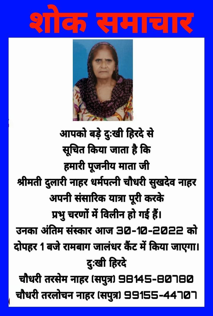 जालंधर कैंट (पंजाब दैनिक न्यूज़) जालंधर कैंट से दुखद समाचार प्राप्त हुआ है, माता श्रीमती दुलारी नाहर धर्मपत्नी चौधरी सुखदेव नाहर अपनी संसारिक यात्रा पूरी करके प्रभु चरणों में विलीन हो गई हैं। उनका अंतिम संस्कार आज 30-12-2022 को दोपहर 1 बजे रामबाग दीप नगर जालंधर कैंट में किया जाएगा। यह जानकारी चौधरी तरसेम नाहर (सपुत्र) 98145-80780 चौधरी तरलोचन नाहर (सपुत्र) 99155-44727 ने दी