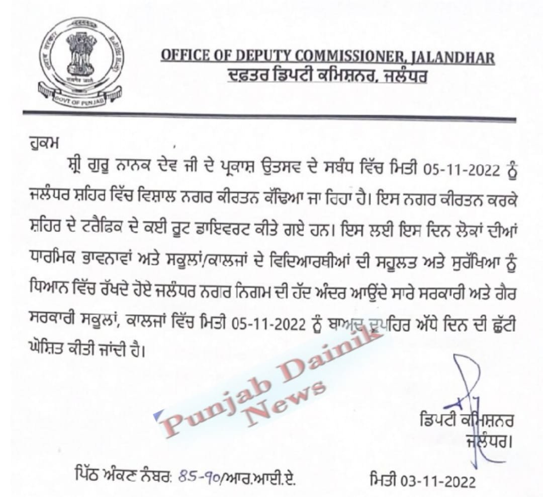 ਜਲੰਧਰ (ਪੰਜਾਬ ਦੈਨਿਕ ਨਿਊਜ਼) ਡੀਸੀ ਜਲੰਧਰ ਨੇ ਸਰਕਾਰੀ ਅਤੇ ਗੈਰ ਸਰਕਾਰੀ ਸਕੂਲਾਂ,ਕਾਲਜਾਂ ਵਿੱਚ ਮਿਤੀ 05 ਨਵੰਬਰ ਨੂੰ ਅੱਧੇ ਦਿਨ ਦੀ ਛੁੱਟੀ ਕੀਤੀ ਘੋਸ਼ਿਤ ਆਦੇਸ਼ ਪੜ੍ਹੋ