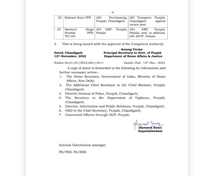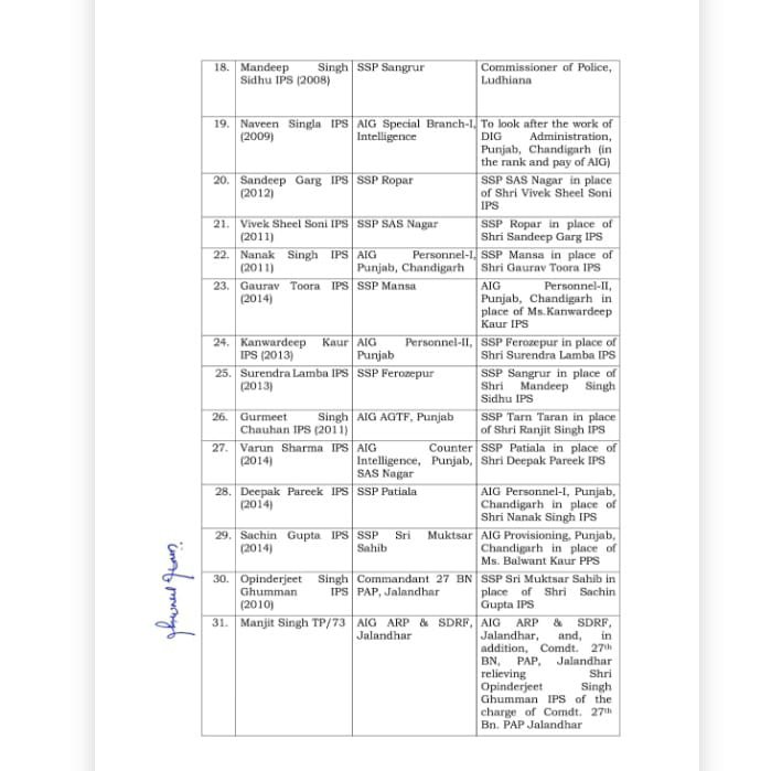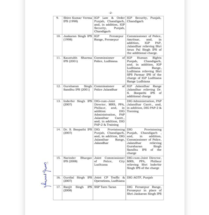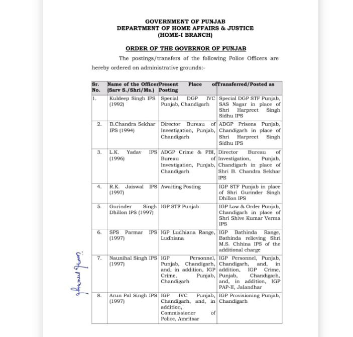 चंडीगढ़ (पंजाब दैनिक न्यूज़) जालंधर,अमृतसर और लुधियाना के पुलिस कमिश्नर सहित बड़े पुलिस अधिकारियों के हुए तबादले