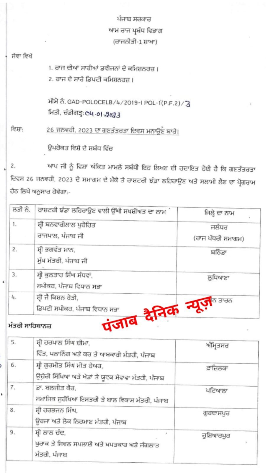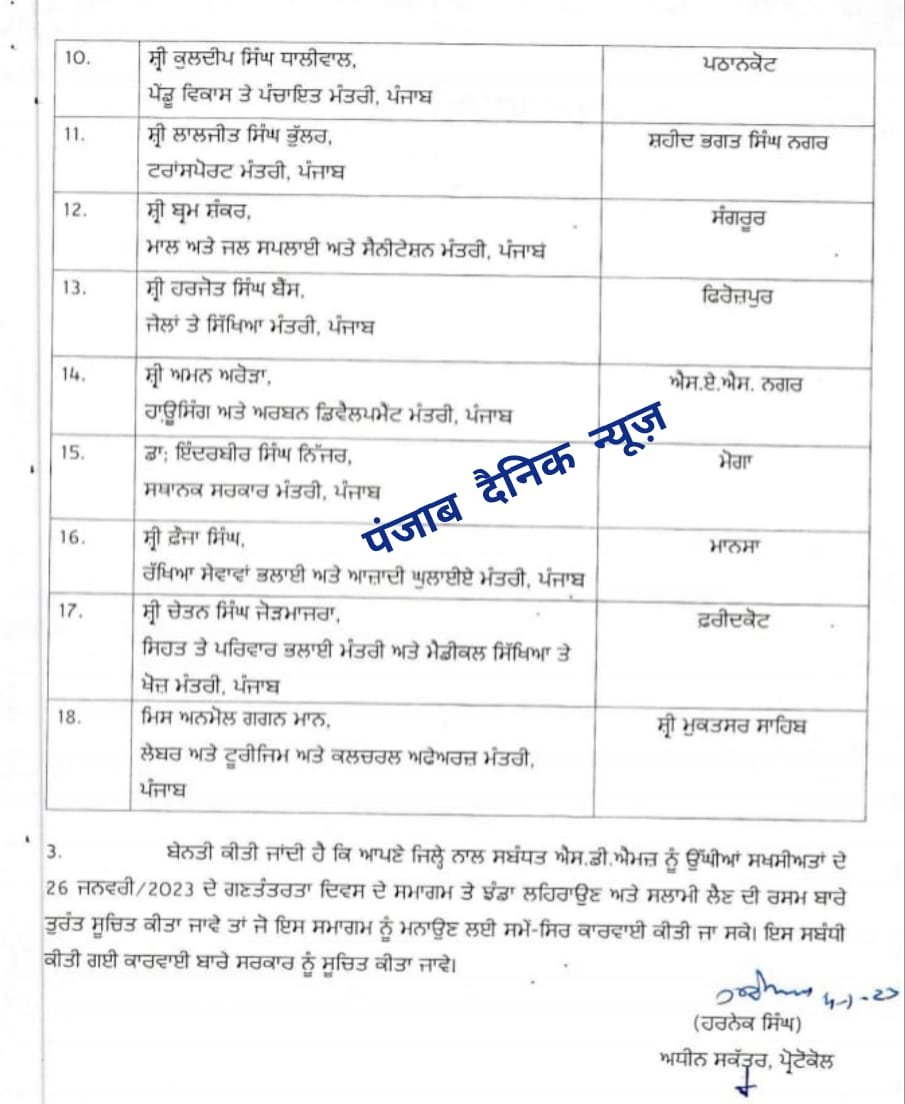 ਜਲੰਧਰ (PUNJAB DAINIK NEWS) ਗਣਤੰਤਰਤਾ ਦਿਵਸ 26 ਜਨਵਰੀ ਦੇ ਮੌਕੇ ਤੇ ਰਾਜਪਾਲ ਬਨਵਾਰੀ ਲਾਲ ਪ੍ਰੋਹਿਤ ਜਲੰਧਰ ਤੇ CM ਭਗਵੰਤ ਮਾਨ ਬਠਿੰਡਾ ਵਿੱਚ ਰਾਸ਼ਟਰੀ ਝੰਡਾ ਲਹਿਰਾਉਣ ਲਿਸਟ ਦੇਖੋ
